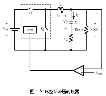 滯環(huán)控制功率轉(zhuǎn)換器的運(yùn)行可如下簡述。以圖1中的降壓轉(zhuǎn)換器為例,當(dāng)輸出電壓VOUT下降低于閾值VREF時(shí),那么開關(guān)S1便會(huì)開啟(S2作為互補(bǔ)工作性質(zhì))。相反,當(dāng)VOUT高于VREF時(shí),那S1便會(huì)關(guān)閉。這種運(yùn)作方式與可變結(jié)構(gòu)控制系統(tǒng)類似,它能夠依據(jù)一個(gè)超平面(hyper-plane)來轉(zhuǎn)換控制法則。因此,可變結(jié)構(gòu)控制理論便成為分析滯環(huán)控制功率轉(zhuǎn)換器的最佳工具。