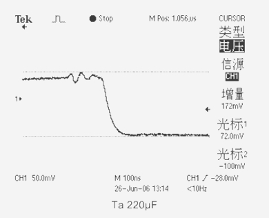 3、當測試電容為(Ta)鉭電解電容器CT=220μF ESR=73mΩ時,輸出電壓下跌值為172mV。