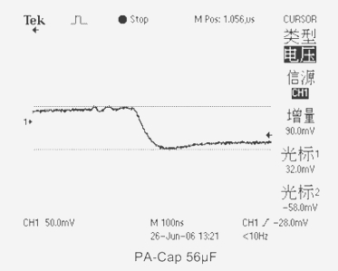 4、當測試電容采用(PA-Cap)聚合物片式疊層鋁電解電容器CT=56μF ESR=23mΩ時,輸出電壓下跌值為90mV。