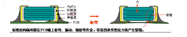 在破壞性的抗折板測試中,PCB板將持續彎曲直到貼片電容產生破壞為止,在這種模擬比較實驗中,可以發現具有柔性端頭設計的產品中,沒有在陶瓷結構中產生裂縫,而是從彈興銀層產生撕裂現象。