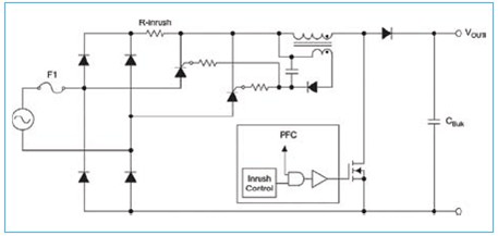 UCC28070 以連續導電模式 (CCM) 運行。同時,也可選用 UCC28060——以轉移模式 (TM) 運行。UCC28060 具備類似的優點,這些優點源于波紋電流的消除,但是同時還提供了一些較低成本的解決方案。最引人矚目的是,由于在轉移模式下運行時,不存在反向恢復條件,所以采用低成本的升壓二極管。在 UCC28070 或其設計中集成浪涌電流限制功能,只需將圖 3 中的浪涌電流組件添加到其中的一個相位電感上即可。
