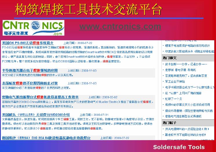 電子元件技術網http://www.szzhuce.cn/club/muellerindex?ref=top_nav可以提供給我們一個平臺,在這個平臺里面,我們可以對于焊接設備的一些使用性能可以進行一些討論,對于新型焊接工藝本身的工藝特點進行一些分析,對于焊接材料,對于新工藝、新材料我們可以進行相應的分析,大家也可以直接,如果網絡方便的話,登錄到這個網站,我相信在這個平臺上可以一起努力,為之后的行業發展起到更多的推動作用。