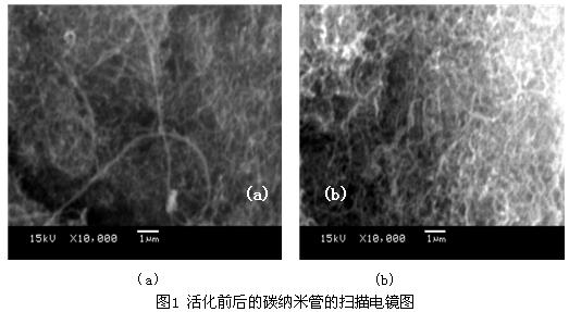 碳納米管一般是由為數眾多的芳香不定域碳原子組成的極端疏水的大分子,幾乎不溶于任何溶劑,并在溶液中較易聚集成束,這些特性限制了碳納米管本身所具有的作為電極材料的優良特性。所以在制備電極之前,材料的活化處理很重要,本文以強氧化性的20%硝酸溶液浸泡處理多壁碳納米管25min,可以充分浸潤碳納米管陣列,從而使離子嵌入碳層,產生利于電容性的孔結構。并能溶解由前軀體處理造成溶解在管上的鐵、鎳催化劑和其他酸溶性的雜質。