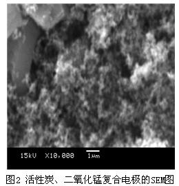 圖2是活性炭/二氧化錳復合電極的SEM圖。從圖中可以看出,電極具有疏松的表面孔結構,這種特有的結構可以為在電極表面發生的雙電層反應和法拉第贗電容反應提供良好的環境。