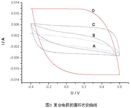 采用三電極體系,即由上述電極作為工作電極,氯化亞汞作為參比電極,大面積鉑黑電極作為輔助電極組成三電極系統。電解質采用6mol/L的KOH溶液,掃描速度為2mV/S,電位范圍為-0.4V~+0.6V。