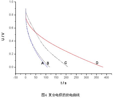圖4給出了各電極在恒定電流為2mA的情況下的放電曲線,可以看出各電極均具有良好的線性放電性質。由公式(1)計算得出A、B、C和D四種電極材料的比電容分別為51.3F/g、56.2F/g、93.2F/g和126F/g。由上節分析可知,雙電層和法拉第贗電容的共同作用,提高了活性炭/二氧化錳復合電極的容量,同時也表現出了良好的放電特性。在對電容容量的貢獻上,二氧化錳的作用要優于碳納米管。