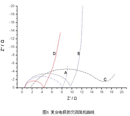 此外由圖5也可以看出,當電極中碳納米管的含量增加時,傳遞電阻呈現遞減的趨勢。這是由于碳納米管在導電性上具有活性炭不可比擬的優點:碳納米管可以看成是六邊形的石墨層在空間通過360°卷曲而成,隨著在電極中含量的增加,碳納米管交織纏繞的程度增大,為電解液離子提供了良好的導電通道。因此,隨著含量的增加,阻抗圓的半徑減小,使得復合電極材料的阻抗特性越好。