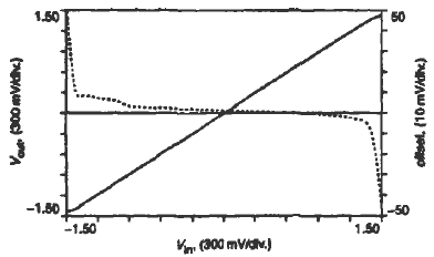 在中部電源電壓區(qū),PMOS和NMOS輸入對是有效的,而且它們的偏置電流通過電流鏡M4P--M5P和M4N--M5N鏡像到該電路的輸出端。這種結(jié)構(gòu)允許NMOS輸入對驅(qū)動在電源電壓區(qū)的輸出節(jié)點(diǎn)接近VDD.而PMOS控制輸出端的電壓范圍接近VSS.不幸的是,在接近VDD時,P溝道輸入對截止,而且沒有電流被鏡像到輸出端的底部,關(guān)閉了緩沖器。類似的情況是VSS時.N溝道差分對不是有效的。為了這個原因,晶體管M1PR-M5PR和MlNR-M5NR已包括在圖2中,維持在整個電壓范圍內(nèi)是有效的。