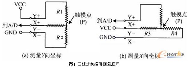 五線式觸摸屏與四線式不同。主要區(qū)別在于五線觸摸屏將其中一導(dǎo)電層的四端均引出來作為四個電極,另一導(dǎo)電層僅僅作為測量的導(dǎo)體輸出X向和Y向的電壓,測量時要交替在X向和Y向上施加電壓。