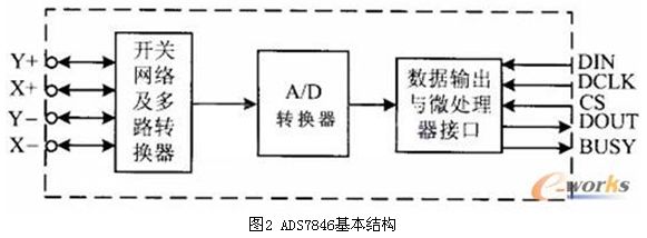 觸摸屏控制器有多種,主要的功能均是在微處理器的控制下向觸摸屏的兩個方向分時施加電壓,并將相應(yīng)的電壓信號傳送給自身A/D轉(zhuǎn)換器,在微處理器SPI口提供的同步時鐘作用下將數(shù)字信號讀入微處理器。控制器ADS7846基本結(jié)構(gòu)如圖2所示。