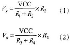 觸摸層的兩個金屬導(dǎo)電層分別用來測量X軸和Y軸方向的坐標。用于X坐標測量的導(dǎo)電層從左右兩端引出兩個電極,記為X+和X-。用于Y坐標測量的導(dǎo)電層從上下兩端引出兩個電極,記為Y+和Y-。這就是四線電阻觸摸屏的引線構(gòu)成。當在一對電極上施加電壓時,在該導(dǎo)電層上就會形成均勻連接的電壓分布國。若在X方向的電極對上施加一確定的電壓,而Y方向電極對上不加電壓時,在X平行電壓場中,觸點處的電壓值可在在Y+(或Y-)電極上反映出來,通過測量Y+電極對地的電壓大小,便可得知觸點的X坐標值。同理,當在Y電極對上加電壓,而X電極對上不加電壓時,通過測量X+電極的電壓,便可得知觸點的Y坐標。測量原理如圖1所示。