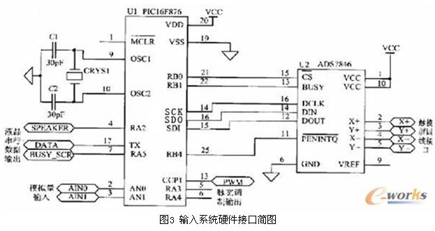 根據(jù)ADS7846與微控制器進行數(shù)據(jù)交換的接口特征,選用PIC16F876的SPI口。SPI口包括三個信號:SDO(串行數(shù)據(jù)輸出),SDI(串行數(shù)據(jù)輸入),SCK(串行同步時鐘)。硬件連接關(guān)系見圖3。