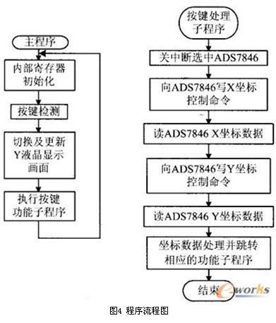 按照以上設(shè)計思想設(shè)計了應(yīng)用軟件,圖4為主程序與觸摸屏輸入檢測部分的程序流程圖。其中,坐標數(shù)據(jù)處理通常采用查表的方法,將用戶命令的坐標形成數(shù)據(jù)表,利用獲得的坐標信息進行變換快速查表,從而提高軟件的運行速度。