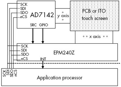 最低功耗級可以將應用處理器和AD7142 CDC置于關斷模式。采用外部32kHz時鐘以及每秒一次的采樣率,典型的MAX IIZ CPLD待機電流只有50μA。當MAX IIZ CPLD的高功效電容探測系統監測到屏幕被觸摸時,它通過中斷信號喚醒處理器。處理器被喚醒后,系統以更高的精度來讀取觸摸位置。