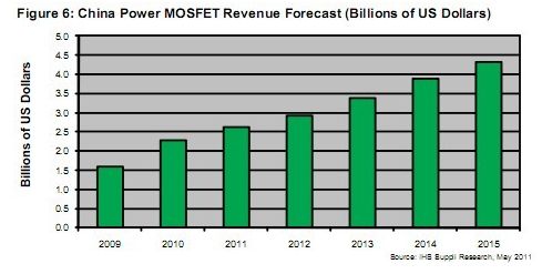 據(jù)IHS iSuppli公司的研究,2010年中國(guó)功率MOSFET市場(chǎng)快速增長(zhǎng),銷售額達(dá)到23億美元,比2009年的16億美元增長(zhǎng)43%。