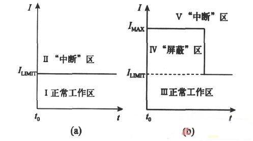當(dāng)負(fù)載電流超過(guò)限制電流ILIMIT 不太多且持續(xù)作用時(shí)間不太長(zhǎng)時(shí),我們希望過(guò)流保護(hù)電路能保持LDO 不中斷工作,因此需要采用“屏蔽”模式屏蔽掉部分可以讓LDO 不中斷運(yùn)行的過(guò)流信號(hào),對(duì)于過(guò)流幅值和持續(xù)作用時(shí)間超過(guò)范圍的過(guò)流信號(hào),過(guò)流保護(hù)電路又能采取中斷LDO 工作的模式。傳統(tǒng)的“中斷”模式電流保護(hù)電路工作狀態(tài)如圖1(a)所示,分為正常工作區(qū)Ⅰ和“中斷”區(qū)Ⅱ,當(dāng)負(fù)載電流不超過(guò)ILIMIT 時(shí),LDO 工作在正常工作區(qū),當(dāng)負(fù)載電流超過(guò)ILIMIT 時(shí)LDO 進(jìn)入“中斷”區(qū)。加入“屏蔽”模式后的過(guò)流保護(hù)電路工作狀態(tài)如圖1(b),分為正常工作區(qū)Ⅲ、屏蔽區(qū)Ⅳ以及中斷區(qū)Ⅴ,當(dāng)負(fù)載電流小于ILIMIT 時(shí),LDO 處于正常工作區(qū),當(dāng)過(guò)流信號(hào)的幅值在ILIMIT 和最大幅值電流IMAX 之間,持續(xù)作用時(shí)間在t=tMAX 之內(nèi)即同時(shí)滿足ILIMIT ≤ ILOAD ≤ IMAX,t ≤tMAX 時(shí),LDO 進(jìn)入屏蔽區(qū),這個(gè)范圍之外的過(guò)流信號(hào)將進(jìn)入中斷區(qū)。對(duì)比圖1(a)和(b)可以看出,改進(jìn)過(guò)流保護(hù)電路后的LDO 的正常工作區(qū)包括圖1(b)的正常工作區(qū)Ⅲ和“屏蔽”區(qū)Ⅳ,增大了工作區(qū)的范圍,提高了LDO 的工作效率。