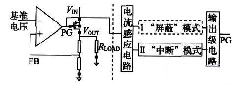 包含過(guò)流保護(hù)電路的LDO整體框圖如圖2所示,虛線左邊是LDO 主體電路,包括誤差放大器、功率管、負(fù)載電阻以及分壓電阻。虛線右邊部分為電流保護(hù)電路,主要作用是感應(yīng)并檢測(cè)負(fù)載電流是否超過(guò)限制電流,然后通過(guò)控制功率管來(lái)決定是否使LDO 中斷運(yùn)行,包括電流感應(yīng)電路和控制電路。傳統(tǒng)的過(guò)流保護(hù)電路只采用圖2 中實(shí)框Ⅱ所示的“中斷”模式(不包括虛框),對(duì)于任何負(fù)載過(guò)流情況,不論持續(xù)作用時(shí)間如何,都使LDO 中斷工作;本文在傳統(tǒng)的“中斷”模式基礎(chǔ)上,增加了“屏蔽”模式(如圖2 中虛框Ⅰ),能有效屏蔽希望LDO不中斷工作的過(guò)流信號(hào),使LDO更高效運(yùn)行,同時(shí)保留“中斷”模式,保證LDO 安全工作。