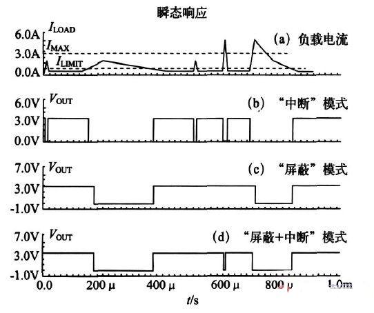 圖5 中(a)曲線表示負(fù)載電流幅值和作用時(shí)間的關(guān)系,ILIMIT 和IMAX 分別為限制電流和最大幅值電流。圖5 中(b)、(c)和(d)曲線分別為采用傳統(tǒng)“中斷”模式、“屏蔽”模式以及“屏蔽+ 中斷”模式過(guò)流保護(hù)電路后LDO 的輸出電壓波形。