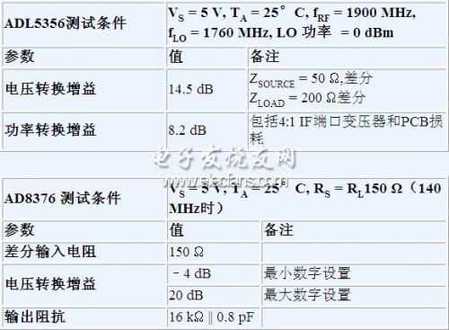 AD8376的電流輸出型電路具有高輸出阻抗,因此其差分輸出需要接150 Ω電阻實現電壓輸出。另一個差分濾波器放置在AD8376和ADC之間,用于衰減二階和三階諧波失真成分,因此該150 Ω負載可以被分成兩部分。首先將300 Ω電阻安裝于AD8376的輸出端。另一個300 Ω電阻由兩個165 Ω電阻和ADC的3 kΩ輸入阻抗構成。兩個165 Ω電阻同時為ADC輸入提供直流共模電壓。LC濾波器的輸入和輸出阻抗均為300 Ω。對于高中頻應用,信號源和負載的阻抗的完美匹配是非常重要的。完整接口如圖4所示。