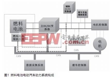 目前,燃料電池電動(dòng)汽車(FCEV)成為我國(guó)汽車科技創(chuàng)新主攻方向。燃料電池電動(dòng)汽車動(dòng)力系統(tǒng)主要由燃料電池發(fā)動(dòng)機(jī),DC/DC變換器,蓄電池,電機(jī)控制器(變頻器)及電機(jī),整車控制器,數(shù)據(jù)采集系統(tǒng)及CAN總線組成,如圖1所示。其中DC/DC變換器可以對(duì)燃料電池的輸出進(jìn)行控制及能量的傳遞與轉(zhuǎn)換,成為燃料電池電動(dòng)汽車關(guān)鍵零部件之一。在燃料電池電動(dòng)汽車運(yùn)行過程中,DC/DC變換器所處的電磁環(huán)境十分復(fù)雜,各種形式的電磁干擾很多,嚴(yán)重影響了DC/DC變換器的正常運(yùn)行。因此,研究FCEV用DC/DC變換器的電磁兼容性對(duì)DC/DC變換器乃至燃料電池電動(dòng)汽車的可靠運(yùn)行具有重要意義。