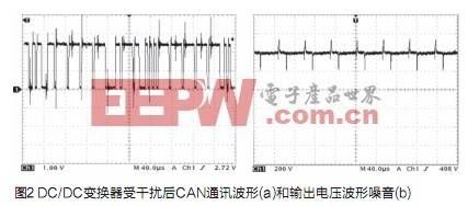 FCEV用DC/DC變換器的功率一般比較大,通常選擇IGBT為功率開關(guān)管。功率開關(guān)管IGBT工作過程中產(chǎn)生高的du/dt和di/dt以及浪涌電流和尖峰電壓[1],這是FCEV用大功率DC/DC變換器產(chǎn)生電磁干擾最根本的原因。另外功率開關(guān)管開通和關(guān)斷瞬間,由于分布電感和分布電容的存在,電感電流容易發(fā)生高頻振蕩,這些因素都會(huì)產(chǎn)生強(qiáng)大的電磁干擾,這在FCEV用大功率DC/DC變換器中表現(xiàn)的尤為明顯。這種電磁干擾嚴(yán)重影響整車控制器與CAN通信,導(dǎo)致CAN通訊頻繁報(bào)錯(cuò),無(wú)法正常通訊。CAN通訊受干擾后的傳輸波形如圖2(a)所示。從圖中可以明顯看到,變換器開關(guān)噪音疊加在CAN通訊脈沖上,并且幅度很大。此外,嚴(yán)重的電磁干擾也會(huì)使大功率DC/DC變換器輸出紋波過大,紋波過大直接影響大功率DC/DC變換器的性能[2]。圖2(b)是用示波器采集到的變換器未經(jīng)濾波處理的輸出電壓波形,從圖中可以看到,輸出電壓上疊加了大量的開關(guān)噪音。