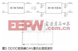 FCEV用大功率DC/DC變換器產(chǎn)生的電磁干擾以傳導(dǎo)干擾為主。目前最常用的方法就是在DC/DC變換器輸入和輸出端加裝濾波電容器。如圖3,為了減小FCEV用大功率DC/DC變換器對(duì)CAN通訊的干擾,在變換器輸入輸出端加適量的接地電容,CAN通訊波形得到有效改善。