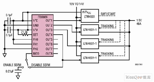 硅振蕩器為多相、擴(kuò)頻開關(guān)穩(wěn)壓器時(shí)鐘提供了一個(gè)理想的平臺(tái)。除了具有一個(gè)板上時(shí)鐘發(fā)生器之外,這些固態(tài)器件還能將擴(kuò)頻調(diào)制與多相輸出組合起來(lái)。考慮到這一點(diǎn),凌力爾特公司開發(fā)出了LTC6909(圖1),這是一款具有8個(gè)單獨(dú)多相輸出的精準(zhǔn)擴(kuò)頻硅振蕩器。單個(gè)電阻器負(fù)責(zé)在12.5kHz至 6.67MHz的范圍內(nèi)選擇輸出頻率。三個(gè)邏輯輸入用于設(shè)定輸出相位關(guān)系(范圍從45°至120°),從而允許LTC6909為多達(dá)8個(gè)相位提供同步。可以啟用一種偽隨機(jī)擴(kuò)頻調(diào)頻,頻率擴(kuò)展量在中心頻率的±10%。用戶可選擇3種調(diào)制速率之一,以確保調(diào)制速率不超過(guò)穩(wěn)壓器的帶寬。此外,LTC6909還具有一個(gè)創(chuàng)新的濾波器,該濾波器負(fù)責(zé)跟蹤SSFM調(diào)制速率并在頻率轉(zhuǎn)換之間提供平滑處理。