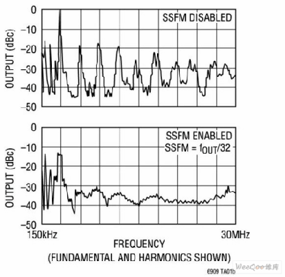 除了多相同步之外,還可以通過(guò)連續(xù)改變開關(guān)穩(wěn)壓器時(shí)鐘的頻率來(lái)改善EMI。這種被稱為SSFM的技術(shù)不允許發(fā)射能量在任何接收器的頻段中停留過(guò)長(zhǎng)的時(shí)間,從而改善了EMI。為了最大限度地發(fā)揮SSFM的效用,主要有4個(gè)必需考慮的因素:受影響接收器的帶寬、頻率調(diào)制的方法、頻率擴(kuò)展量和調(diào)制速率。