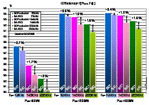 圖10:在VmainsRMS = 90 V時,450 W功率因數校正器的三個不同的輸出功率和三個開關頻率的能效對比