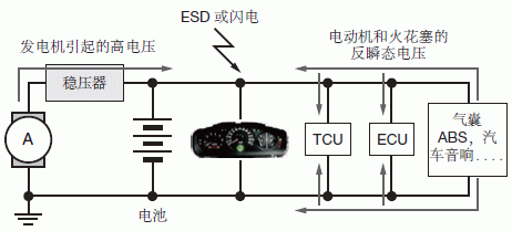 電子控制單元、傳感器和信息娛樂系統(tǒng)等汽車電子設(shè)備連接在一根電源線上(圖4)。這些電子產(chǎn)品的電源是電池和交流發(fā)電機,這兩種電源的輸出電壓都不穩(wěn)定,容易受溫度、工作狀態(tài)和其他條件影響。此外,使用燃油噴射系統(tǒng)、閥、電機、電氣和水解控制器等電磁線圈負(fù)載的汽車系統(tǒng),會把ESD、尖峰噪聲和其他類型的瞬態(tài)和浪涌電壓引入到電源和信號線上。