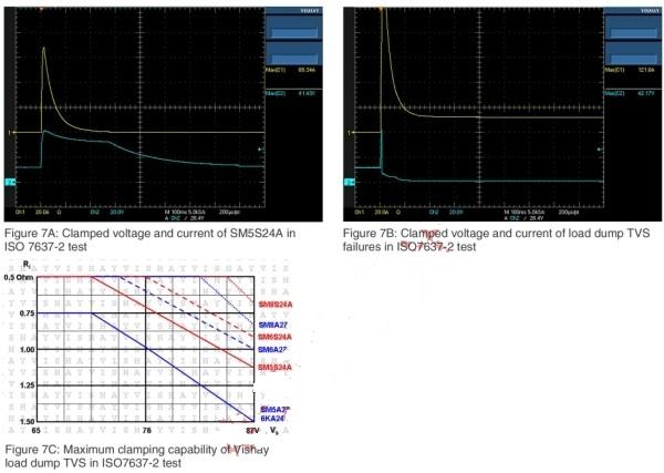 圖7A:ISO 7637-2測試中SM5S24A的鉗位電壓和電流。圖7B:ISO 7637-2測試中甩負(fù)荷TVS失效情況下的鉗位電壓和電流。圖7C:ISO 7637-2測試中Vishay甩負(fù)荷TVS的最大鉗位性能。