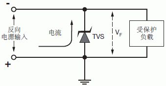 在反向電源輸入模式中,電源線電壓與TVS VF的電壓相同,這種反偏模式會(huì)引起電子線路故障,外延型TVS的低正向壓降能夠很好地解決這個(gè)問(wèn)題,如圖8所示。