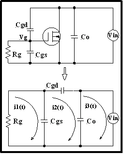 當(dāng)LS MOSFET由門極驅(qū)動器關(guān)閉而HS MOSFET正被打開時(shí),就會遇到擊穿損耗。在轉(zhuǎn)換期間,門極-漏極間電容通過由Cgd和Rg//Cgs組成的潛在的分壓器把漏極電壓耦合到門極。如果這個(gè)耦合電壓大于門限電壓Vgth,那么,LS MOSFET將為打開,從而產(chǎn)生一條流過HS和LS MOSFET的低阻的電流通路,最終造成過度損耗。支配相對于地的門極電壓的方程如下所示: