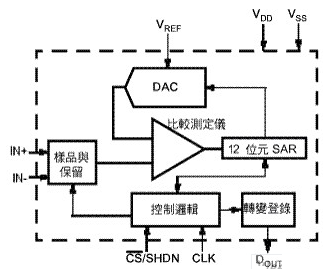 在本方塊圖中,取樣/保持、比較器、大部份的數字模擬轉換器及12位SAR都是模擬;其余電路部份是數字。結果,本轉換器內之模擬電路耗用大部份的電源與電流,除數字模擬轉換器與接口中發生的小量切換電流外,數字電路的消耗電流極少。