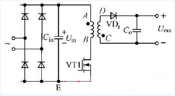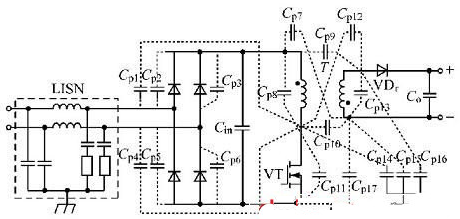 在圖1所示的反激式開關(guān)電源中,變換器工作于連續(xù)模式時,開關(guān)管VT導通后,B點電位低于A點,一次繞組匝間電容便會充電,充電電流由A流向B;VT關(guān)斷后,寄生電容反向充電,充電電流由B流向A。這樣,變壓器中便產(chǎn)生了差模傳導EMI。同時,電源元器件與大地之間的電位差也會產(chǎn)生高頻變化。由于元器件與大地、機殼之間存在著分布電容,便產(chǎn)生了在輸入端與大地、機殼所構(gòu)成回路之間流動的共模傳導EMI電流。