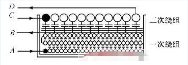 在開關(guān)電源中,輸入整流后的電流為尖脈沖電流,開關(guān)開通和關(guān)斷時變換器中電壓、電流變化率很高,這些波形中含有豐富的高頻諧波。另外,在主開關(guān)管開關(guān)過程和整流二極管反向恢復(fù)過程中,電路的寄生電感、電容會發(fā)生高頻振蕩,以上這些都是電磁干擾的來源。開關(guān)電源中存在大量的分布電容,這些分布電容給電磁干擾的傳遞提供了通路,如圖2所示。圖2中,LISN為線性阻抗穩(wěn)定網(wǎng)絡(luò),用于線路傳導干擾的測量。干擾信號通過導線、寄生電容等傳遞到變換器的輸入、輸出端,形成了傳導干擾。變壓器的各繞組之間也存在著大量的寄生電容,如圖3所示。圖3中,A、B、C、D4點與圖1中標識的4點相對應(yīng)。