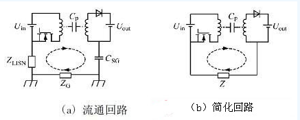 具體到變壓器中,一次繞組與二次繞組之間的電位差也會產(chǎn)生高頻變化,通過寄生電容的耦合,從而產(chǎn)生了在一次側(cè)與二次側(cè)之間流動的共模傳導EMI電流。交流等效回路及簡化等效回路如圖4所示。圖4中:ZLISN為線性阻抗穩(wěn)定網(wǎng)絡(luò)的等效阻抗;CP為變壓器一次繞組與二次繞組間的寄生電容;ZG為大地不同點間的等效阻抗;CSG為輸出回路與地間的等效電容;Z為變壓器以外回路的等效阻抗。