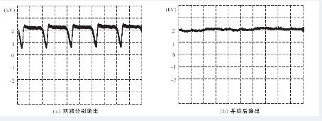 圖6 中所標(biāo)的電壓值為乘以分壓器變比以后的值。圖6(a) 為沒有經(jīng)過并聯(lián)的兩路分別輸出時(shí)的電壓波形,可以看到,單路電壓輸出存在缺口,而且缺口處脈動(dòng)較大,并有一定的毛刺。圖中6(b)為兩路并聯(lián)后輸出的電壓波形(未經(jīng)電容濾波),與圖6(a)相比較,可以清楚地看到兩路并聯(lián)后,大的缺口在輸出波形中消失,輸出電壓脈動(dòng)明顯減小,紋波變低,達(dá)到了實(shí)驗(yàn)?zāi)康模?yàn)證了設(shè)計(jì)思想的正確性。