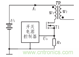 開關電源從控制方式上可分為電壓控制型和電流控制型,從隔離變壓器的驅動方式上可分為單端型和雙端型。在這些電路形式中, 許多形式的開關電源需要使用電流傳感器檢測電流,或者用于脈沖占空比的控制,或者用于電路的保護。電流控制型開關電源直接對輸入的脈沖電流進行檢測,能同時根據輸入電壓和輸出電壓的變化綜合調節(jié)脈沖占空比,具有動態(tài)響應速度快,輸入電壓的波動對輸出電壓影響小等特點。電流控制型開關電源中需要電流傳感器檢測輸入的脈沖電流, 以作為開關電源調節(jié)脈沖占空比、穩(wěn)定輸出電壓的反饋信號。圖1 所示為一個電流控制型的反激式開關電源的輸入通道原理圖。圖中電阻RS在電路中的作用即是電流傳感器, 在功率開關T1導通時, 流過隔離變壓器原邊繞組W1的電流Ii將使RS上產生電壓降US,US即為向開關電源控制器反饋的輸入電流值信號。根據輸出電壓反饋信號和輸入電流值反饋信號US, 開關電源控制器將綜合調節(jié)電路的脈沖占空比,保證輸出電壓的穩(wěn)定。