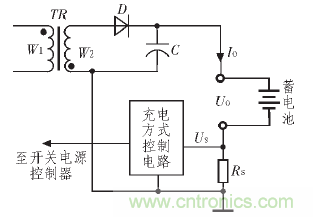 為了提高開關電源工作的可靠性,防止輸出電流過流等情況發(fā)生,許多開關電源在輸出端接入電流傳感器,檢測輸出電流的大小,一旦輸出電流超過設計標準,保護電路即采取必要措施保護開關電源的安全[3]。此外,當開關電源作為蓄電池充電器時,也需要檢測輸出電流的大小,以此了解蓄電池的充電情況,適時切換充電方式,達到提高充電效率,延長蓄電池的使用壽命的效果。圖3 為一個蓄電池充電器的輸出電流檢測原理圖, 電流檢測電阻RS將蓄電池的充電電流轉化為電壓US,反饋給充電方式控制電路,由控制電路根據充電電流的大小適時切換充電方式[4]。