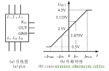 常用的TBC-DS 系列閉環(huán)霍爾電流傳感器的引線框圖和傳輸特性如圖5 所示[6]。圖5(a)所示的霍爾電流傳感器引線中,I+1~3和I-1~3是被測電流的串入繞組引腳, 其中,I+1和I-1是一個被測電流繞組的引腳,I+2和I-2、I+3和I-3也分別各是一個被測電流繞組的引腳。當3 個被測電流繞組并聯(lián)時,霍爾電流傳感器的額定測量電流為IPN1; 若將兩個繞組并聯(lián)再與一個繞組串聯(lián)時,霍爾電流傳感器的額定測量電流為IPN2;若將3 個繞組相互串聯(lián)時,霍爾電流傳感器的額定測量電流為IPN3。3 個額定測量電流間的關系為:IPN1=2 IPN2=3 IPN3。可見,通過3 組被測電流繞組的不同接法,可以改變霍爾電流傳感器的額定測量電流值,擴展測量區(qū)間。VCC為電源引腳,電源電壓通常為5 V;GND 是電源和傳感器輸出電壓的地;OUT 是傳感器電壓輸出引腳。由5(b)所示的霍爾電流傳感器傳輸特性可見,當被測電流為0 時,其輸出電壓UOUT =2.5 V;當被測電流不為0 且方向為從I+至I-時,輸出電壓UOUT>2.5 V,當被測電流不為0 且方向為從I-至I+時,輸出電壓UOUT<2.5 V。IPN和-IPN是霍爾傳感器的正負額定電流, 當被檢測電流達到額定電流時,根據電流方向的不同,輸出電壓UOUT 的值分別為3.125 V 或1.875 V, 即相對于2.5 V 的中心值有±0.625 V的偏移。當被檢測電流值絕對值大于IPN 時,霍爾傳感器仍可輸出與被檢測電流成線性關系的電壓值,直至被檢測電流達到霍爾傳感器的最大檢測電流IPmax。通常,IPmax>3 IPN。