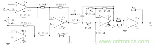 放大處理后的電壓信號,雖然在幅值上達到了可以處理的范圍,但模/數(shù)電壓轉換的范圍是0~5 V,而傳感器輸出的電壓存在負值,為了使電壓匹配,信號電壓在接人模/數(shù)轉換器前可以加一級加法電路,將電壓信號全部轉換為正值。放大電路、濾波電路和加法電路均使用LM324實現(xiàn),硬件電路如圖4所示。