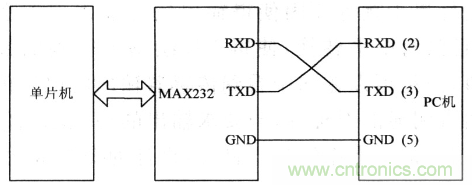 該設計中采用異步串行通信的方式。而AT89C51 單片機的串行口,當工作于方式1,2和3時,UART(通用異步接收和發(fā)送)可以實現(xiàn)單片機系統(tǒng)與PC機之間的串行通信。PC機串行通信主要是通過串行口芯片8251實現(xiàn)的。8251有10個寄存器,端口地址從3F8H~3FEH(c0M1),可以通過對8251編程來指定通信協(xié)議即通信的波特率、數(shù)據(jù)位數(shù)、奇偶類型和停止位長度。另外由于Pc機串口的電平是RS 232電平,不與單片機串口的TTL電平兼容,因此需要在它們之間進行電平轉換。傳統(tǒng)的方法是使用MCl488將TTL電平轉換成RS 232電平,用MCl488實現(xiàn)反向轉換,由于MCl488需要±12 V電壓,使用中非常不便,故該設計采用MAXIM公司的產品片MAX232來實現(xiàn),由單+5 V的電壓供電,既可實現(xiàn)TTL到RS 232的電平轉換,也可實現(xiàn)RS 232到TTL電平的轉換,使用十分方便,具體的線路如圖5所示。