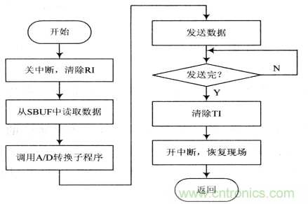 由于單片機多應用于實時性較強的控制場合,為了盡量少占用CPU的時間,充分發(fā)揮CPU的功能。該系統(tǒng)在單片機程序設計中采用中斷方式與PC機進行通信。主程序只進行串行通信、數(shù)碼管實時顯示、模/數(shù)轉換結果的初始化和循環(huán)等待串行中斷工作,當接收到PC機發(fā)來的信號時,就轉人中斷服務程序,進行A/D轉換,并向Pc機發(fā)送數(shù)據(jù)。中斷服務子程序流程圖如圖6所示。