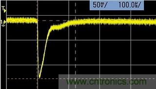這是任何電源都存在的正常現象。當負載吸收電流發生跳變的瞬間,就會造成電源輸出端的電壓瞬間偏離設定值。這個示波器屏幕的截圖(圖1),就是當我的一個電源的負載電流,從1mA 瞬間變化到500mA時, 輸出電壓經歷了約30uS 瞬間變化。