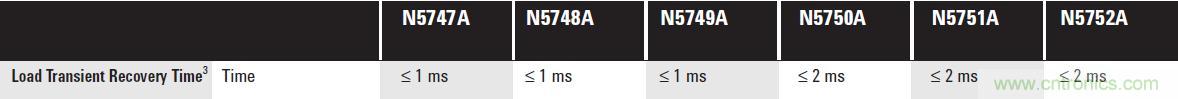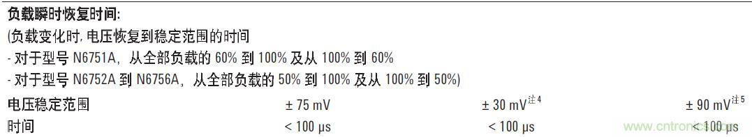 直流電源的瞬態響應時間快慢和跌落的幅度不盡相同。例如,安捷倫N6705B直流電源分析儀中所用的高性能模塊N675xA, 瞬態響應指標如下: