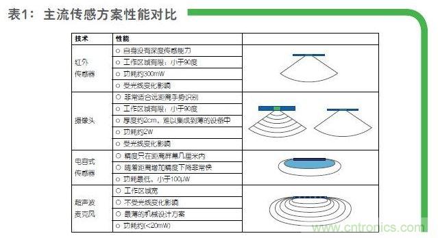 在數(shù)字超聲波麥克風(fēng)出現(xiàn)后,由于對環(huán)境光線沒要求(黑暗中也能精準(zhǔn)感測)、很容易測得距離/景深等特殊性能,有先見的系統(tǒng)公司紛紛采用該技術(shù)實現(xiàn)一些特有的手勢識別、距離感應(yīng)等應(yīng)用。Khamharn指出超聲波的方案性能相對更穩(wěn)定且成本更低,特地為大家對比了超聲波麥克風(fēng)和目前主流傳感器的性能對比,如表一所示。