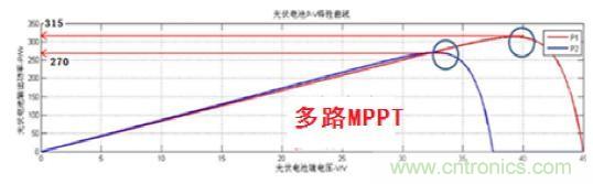 因為光伏電池陣列是單位光伏電池組串組成的,每個組串都有自己的工作電壓,電壓很大概率上不一致,如果以傳統的集中式方案的話,組串在匯流箱能量匯集時并聯會發生一次并聯失配,匯流箱到逆變器能量并聯時再發生一次并聯失配,嚴重影響光伏電池組件的發電效率。如下圖3所示,單路MPPT的情況下,光伏電池組件受到各種因素的影響,會導致出現兩個或多個波峰的情況,跟蹤到任何一個波峰都會對發電量造成損失。而如果多路MPPT的情況下,能精確跟蹤到每一個組串的特性,形成多條MPPT曲線,使得每串光伏電池組串最大效能的發揮作用。