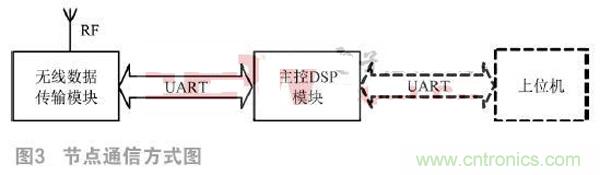 在傳感器網(wǎng)絡(luò)中,采用ZigBee通信協(xié)議時(shí),節(jié)點(diǎn)被分為Coordinator、Router以及End Device三種。Coordinator負(fù)責(zé)系統(tǒng)的初始化工作,選擇網(wǎng)絡(luò)的信道等參數(shù)建立網(wǎng)絡(luò),供其他節(jié)點(diǎn)加入;Router負(fù)責(zé)節(jié)點(diǎn)之間命令消息的路由轉(zhuǎn)發(fā)實(shí)現(xiàn);End Device負(fù)責(zé)任務(wù)是消息的發(fā)送和接收,只能和父節(jié)點(diǎn)進(jìn)行數(shù)據(jù)通信,不具有路由轉(zhuǎn)發(fā)的功能。在本系統(tǒng)中,Sink節(jié)點(diǎn)主要負(fù)責(zé)監(jiān)控網(wǎng)絡(luò)的建立、上位機(jī)命令的分析處理和操作、數(shù)據(jù)的收集等任務(wù),是整個(gè)網(wǎng)絡(luò)的數(shù)據(jù)存儲(chǔ)和處理中心,在上位機(jī)和監(jiān)控網(wǎng)絡(luò)之間起到橋梁的作用,是系統(tǒng)應(yīng)用中的Coordinator。監(jiān)控網(wǎng)絡(luò)區(qū)域內(nèi)的待定位節(jié)點(diǎn)要具備消息轉(zhuǎn)發(fā)與路由其他節(jié)點(diǎn)的能力,需要可以給所有節(jié)點(diǎn)發(fā)送消息,也可以接收到所有節(jié)點(diǎn)的消息,是系統(tǒng)應(yīng)用中的Router。每個(gè)節(jié)點(diǎn)由無(wú)線數(shù)據(jù)傳輸模塊和主控DSP模塊組成,同一節(jié)點(diǎn)的兩個(gè)模塊之間通過UART總線進(jìn)行通信。節(jié)點(diǎn)之間通過無(wú)線RF射頻方式進(jìn)行通信。Sink節(jié)點(diǎn)與上位機(jī)使用UART總線進(jìn)行通信,未知節(jié)點(diǎn)的通信方式中并不包含該通信方式。節(jié)點(diǎn)的通信方式如圖3所示。