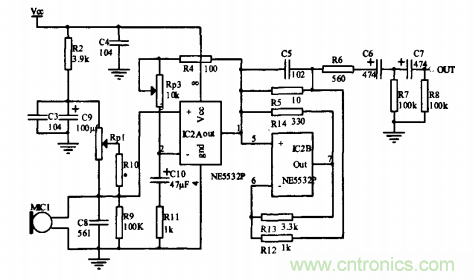 監控拾音器的輸出加入了由c6、R7、c 7、R8構成兩級Rc高通濾波器,濾除信號中的高頻成分,同時電容又起了隔直的作用,使電路達到了較好的性能。